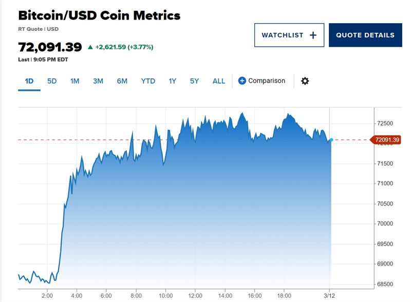 비트코인 가격이 11일 사상 최고인 7만2,000달러를 넘어섰다. CNBC홈피 캡쳐