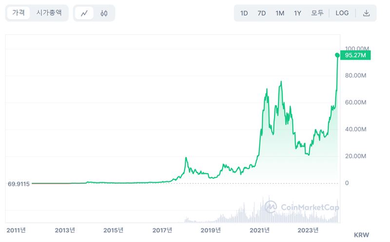 비트코인 등장 이후 최근까지의 가격 추이. 코인마켓캡 홈피 캡쳐