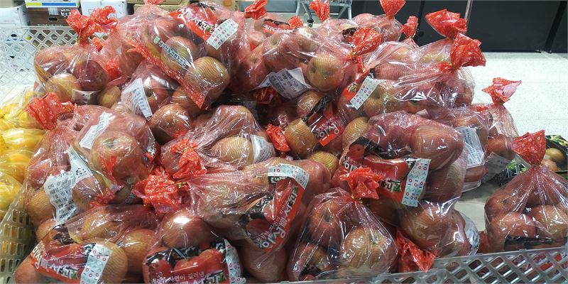 서울 강서구 NH농협 하나로마트에 진열된 봉지 사과. 정부는 이날 윤석열 대통령 주재 민생경제점검회의에서 농산물 가격 안정책을 내놨다.