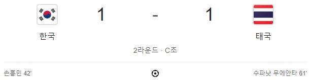 한국의 C조엔 태국·중국·싱가포르가 속해 있으며 한국은 이날 무승부로 조 1위(2승1무·승점 7)를 유지했다. 2위는 태국(1승1무1패·승점 4), 3위는 중국(1승1패·승점 3)이다. 2차 예선에선 조 1~2위 팀이 아시아 최종 예선에 진출한다.