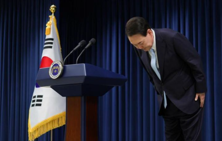 윤석열 대통령이 1일 서울 용산 대통령실에서 대국민담화를 발표하며 국민 불편에 대해 고개 숙여 사과하고 있다. 대통령실