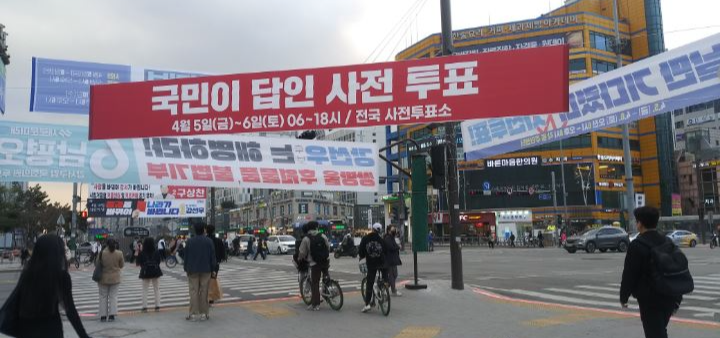 서울 강서구 지하철 5호선 발산역 사거리에 어지럽게 걸린 총선 현수막들. 총선이 코앞에 다가섰음을 알리는 듯하다. 정기홍 기자