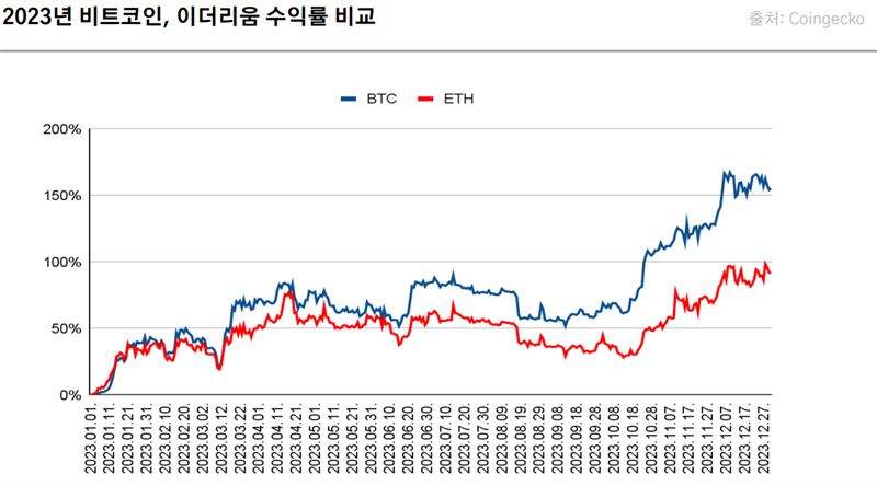 리포트에 따르면 비트코인은 2023년 가격이 160%, 이더리움의 대항마로 꼽히는 솔라나 역시 무려 1100% 이상 각각 상승했지만 이더리움은 90% 오르는데 그쳐 상대적으로 저조했다.
