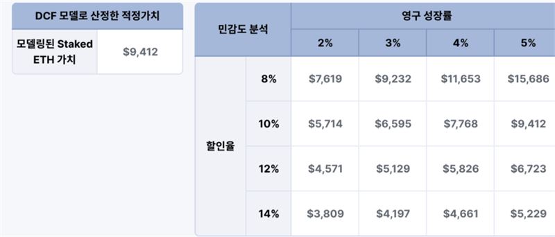 보고서는 이더리움 스테이킹 시 발생하는 수익이 현금 흐름과 유사하다는 점에 착안, 현금흐름할인법(DCF)으로 이더리움의 적정 가치를 평가한 결과 9,412달러가 나왔다고 밝혔다.