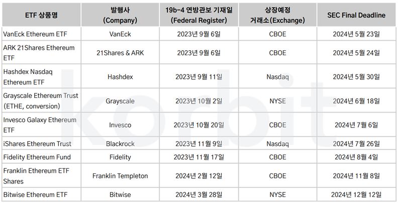 글로벌 자산운용사들의 이더리움 ETF 승인 요청에 대한 미국 당국의 결정 시한이 다음달 23일을 시작으로 줄줄이 이어진다.