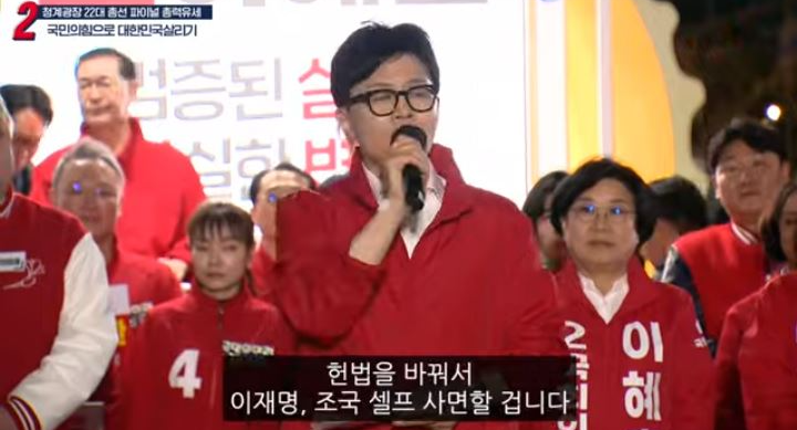 국민의힘 한동훈 비상대책위원장이 9일 서울 청계천에서 열린 '파이널 총력 유세'에서 마지막 한 표를 호소하고 있다. 국민의힘TV