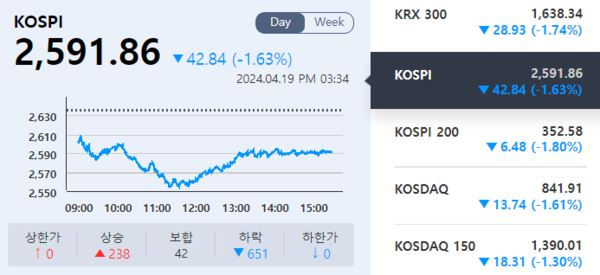 19일 한국거래소에 따르면 코스피는 전 거래일보다 42.84포인트(1.63%) 하락한 2591.86에 마감했다.