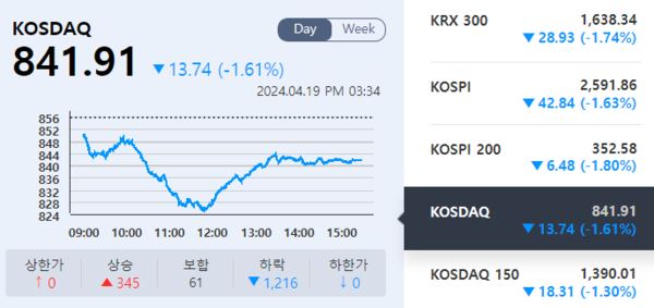 코스닥은 전 거래일보다 13.74포인트(1.61%) 내린 841.91에 장을 마쳤다.