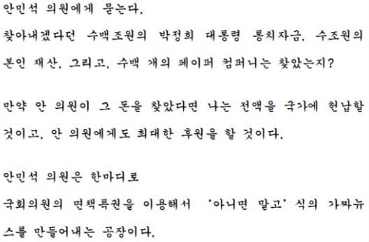 최서원 씨가 안민석 민주당 의원에 대해 쓴 고소장 중 일부. 정준길 변호사