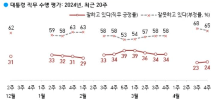 한국갤럽의 4월 넷째주 윤석열 대통령에 대한 직무수행 긍정평가에서 전주와 비슷한 24%로 나왔다.