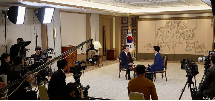 윤석열 대통령이 지난 2월 4일 서울 용산 대통령실 청사에서 가진 KBS '특별대담 대통령실을 가다'에서 박장범 KBS 앵커와 대담을 하고 있다. 대통령실