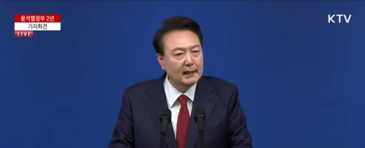 윤석열 대통령이 9일 서울 용산 대통령실에서 기자들의 질문에 답하고 있다. KTV