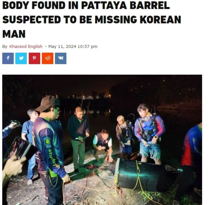 태국 경찰이 11일(현지 시각) 파타야의 한 호수에서 한국인 시신이 발견된 플라스틱 통을 건져 올리고 있다. 태국 매체 카오소드 잉글리시 홈페이지