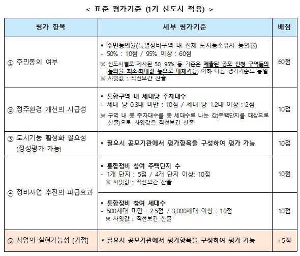 선도지구 선정 평가 항목과 배점을 보면 '주민 동의'가 60점으로 가장 높다. 이어 세대당 주차 대수, 통합 정비 참여 주택단지 수는 10점으로 정했다.