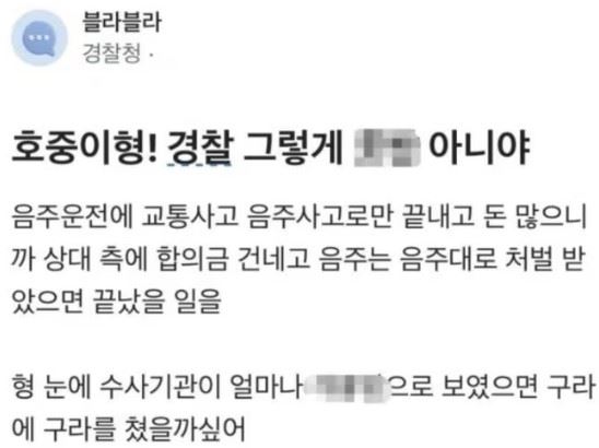 직장인 익명 커뮤니티 '블라인드'에 27일 현직 경찰이 쓴 '호중이형! 경찰 그렇게 X밥 아니야’라는 제목의 글이 올라왔다. 글을 쓴 A 씨는 블라인드에서 경찰청 직원으로 인증됐다.