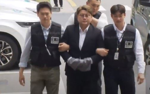 트로트 가수 김호중 씨가 지난 24일 법원의 구속영장 발부로 두 손이 포승줄에 묶인 채 서울 강남경찰서로 호송되고 있다. OBS
