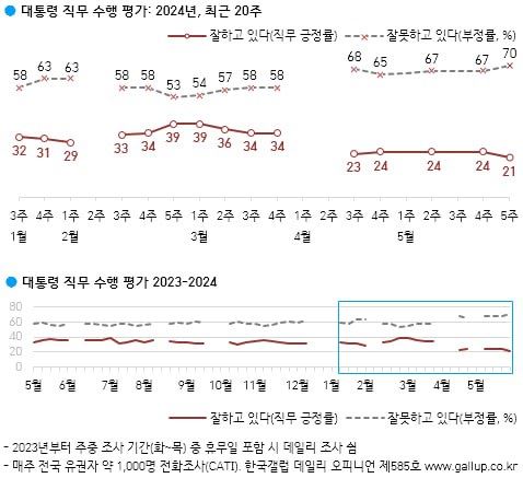 한국갤럽이 28~30일 전국 만 18살 이상 1001명을 대상으로 조사한 결과, 윤 대통령이 직무 수행을 잘 하고 있다는 응답은 21%, 잘 못하고 있다는 70%였다.