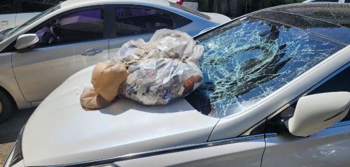 지난 2일 오전 북한의 오물 풍선이 떨어진 경기 안산시의 한 빌라 주차장의 승용차 앞 유리창이 파손돼 있다. 온라인 커뮤니티