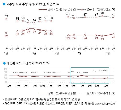 15일 한국갤럽에 따르면 지난 11∼13일 전국 만 18세 이상 1000명을 대상으로 조사한 결과, 윤 대통령의 직무 수행 긍정 평가는 26%였다. 취임 후 최저치인 21%를 기록한 직전 조사(지난달 28∼30일)보다 5%포인트 상승했다. 2주 만이다.