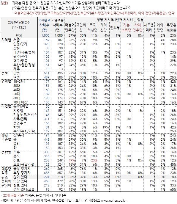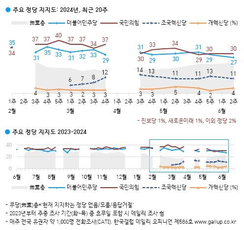 정당 지지도는 국민의힘 30%, 더불어민주당 27%, 조국혁신당 11%, 개혁신당 4%, 진보당과 새로운미래 각각 1%를 보였다. 하지만 23%는 지지 정당이 없다고 답해 큰 변수로 남았다.