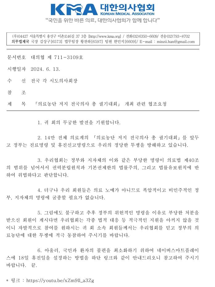 의협은 이날 ‘의료농단 저지 전국의사총궐기대회 관련 안내’ 문자를 통해 “우리 협회는 회원(의사) 권익 보호가 최우선이라는 점, 다시 한 번 상기시켜드린다”며 “행정 기관으로부터 (휴진으로) 부당한 피해를 받으신다면 협회가 적극 나서겠다”고 했다.