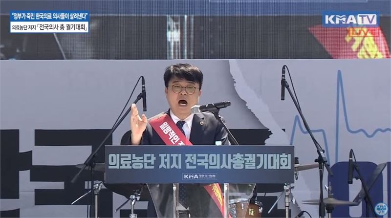 임현택 대한의사협회 회장이 18일 오후 서울 영등포구 여의대로에서 열린 전국 의사 총궐기대회에서 대회사를 하고 있다. 의협 유튜브 캡처