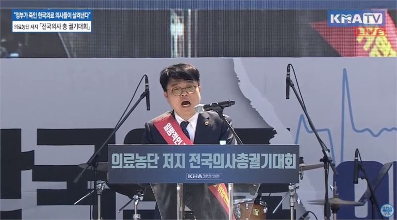 임현택 대한의사협회 회장이 18일 오후 서울 영등포구 여의대로에서 열린 전국 의사 총궐기대회에서 대회사를 하고 있다. 의협 유튜브 캡처