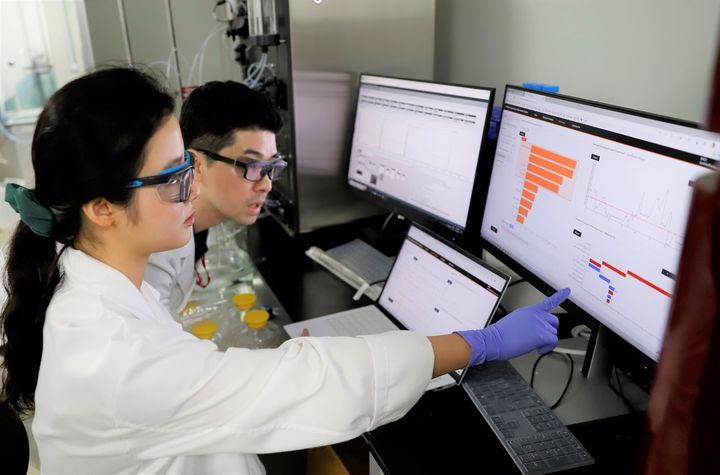 SK바이오사이언스 연구원들이 ADO(AI based Design space Optimization System)를 활용해 실험설계를 논의하고 있다. SK바이오사이언스