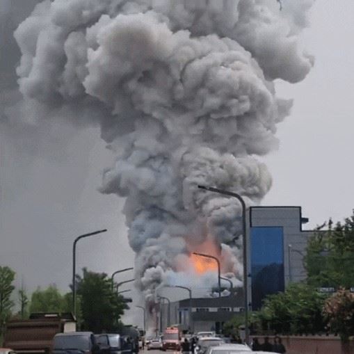 24일 오전 화재 후 폭발로 20여 명의 목숨을 앗아간 경기 화성시 소재 일차전지 업체인 아리셀 공장의 화염 기둥 모습. 엑스(X)