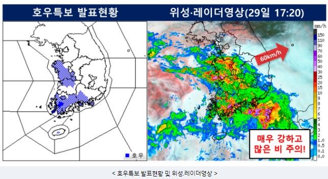 기상청은 "시간당 30~50㎜의 매우 강한 비가 내리는 곳도 있어 각별히 유의해야 한다"고 당부했다.