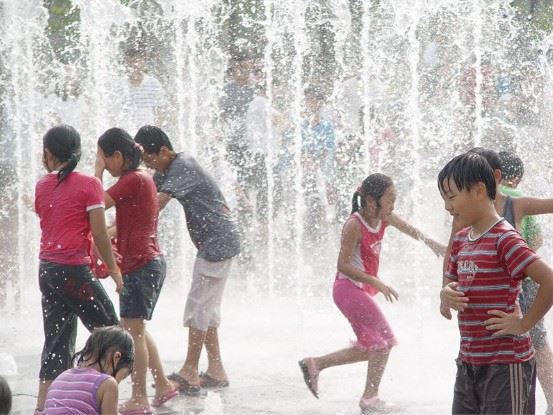 푹푹 찌는 무더위 속에 시원한 분수대를 끼고 노는 어린이들. 20년 전 서울의 언, 분수대를 지나다가 찍었다. 정창현 기자