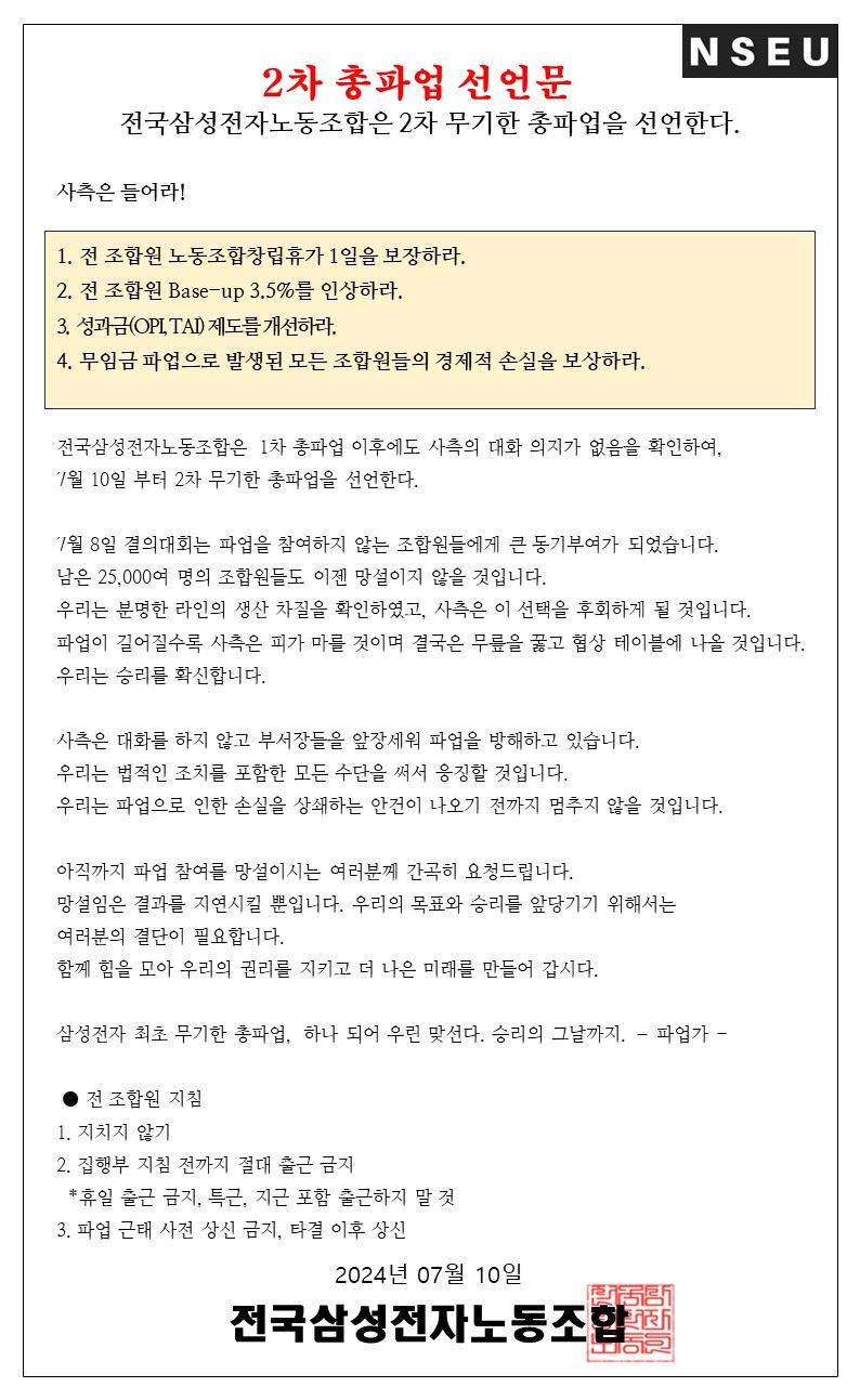 삼성전자 최대 노동조합인 전국삼성전자노동조합(전삼노)이 10일 8~10일 사흘간 1차 총파업에 이어 2차 무기한 총파업을 선언했다.
