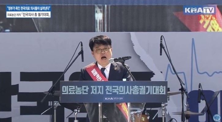 임현택 대한의사협회 회장이 지난 6월 18일 서울 영등포구 여의대로에서 열린 전국 의사 총궐기대회에서 대회사를 하고 있다. 의협 유튜브 캡처