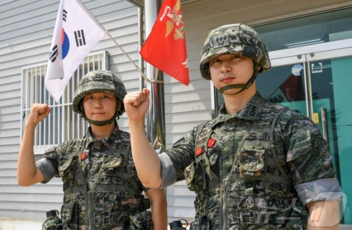해병대 1사단 해안부대 장병들이 해안순찰 중 도로에 쓰러져 있던 80대 A 씨를 구조한 사실이 뒤늦게 알려졌다. 송영찬 대위(오른쪽)와 최성은 중사. 해병대 1사단