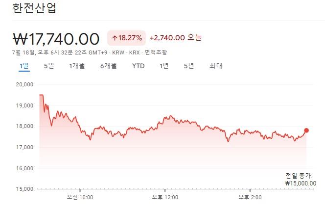 18일 한국거래소에 따르면 이날 한전산업의 주가는 전거래일 대비 18.27% 급등한 1만7740원에 장을 마감했다. 장 시작과 함께 상한가를 치기도 했다. 종가로도 코스피에서 상승률 1위를 기록했다.