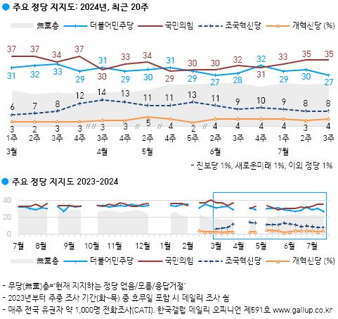 한국갤럽은 지난 16~18일 전국 만 18세 이상 1000명을 대상으로 한 전화 여론조사 결과를 19일 공개했다. 정당 지지율은 국민의힘 35%, 더불어민주당 27%, 조국혁신당 8%, 개혁신당 4%, 진보당·새로운미래 각각 1%, 무당층 23%로 나타났다.