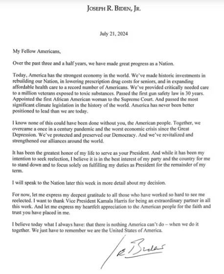 바이든 대통령은 이날 성명을 통해 "재선에 도전하는 것이 내 의도였으나 물러나서 남은 임기 동안 대통령의 직무를 다하는 데만 집중하는 것이 당과 국가에 최선의 이익이라고 믿는다"고 밝혔다