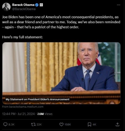 한편 오바마 전 대통령은 바이든 대통령의 대선 후보 사퇴에 대해 '미국을 위한 용단'이라고 밝혔다.