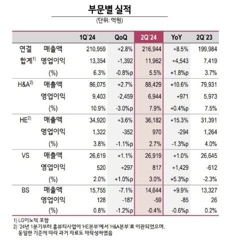 LG전자 2024년 2분기 부문별 실적. LG전자