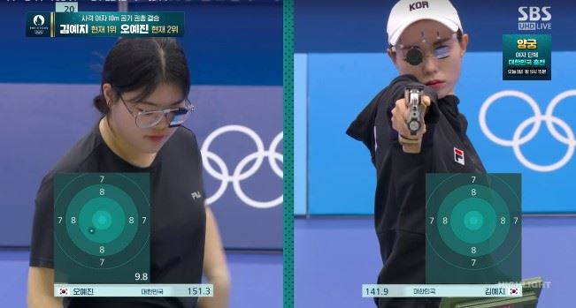 오예진과 김지혜 선수가 공기권총 10m 여자 결선에서 경기를 치르고 있다. SBS 중계