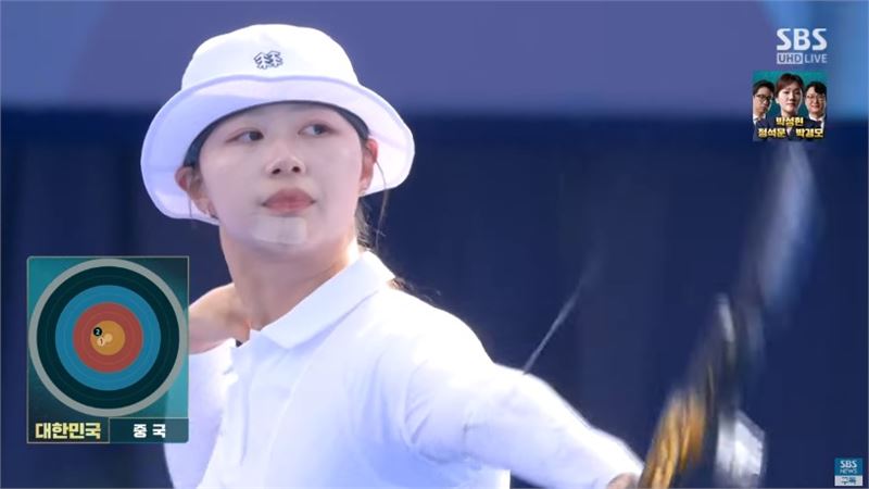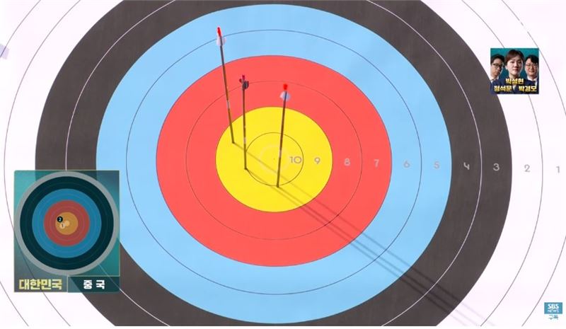 여자양궁 단체 결승전 중국과의 마지막 슛오프에서 과녁에 꽂힌 한국 궁사들의 화살. 이상 SBS 중계