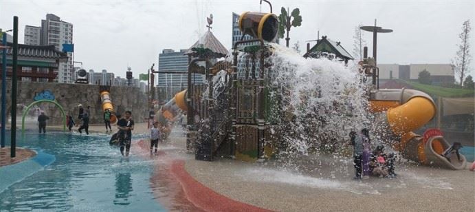 경남 진주시의 한 물놀이장 모습. 물폭탄이 쏟아지고 있다.