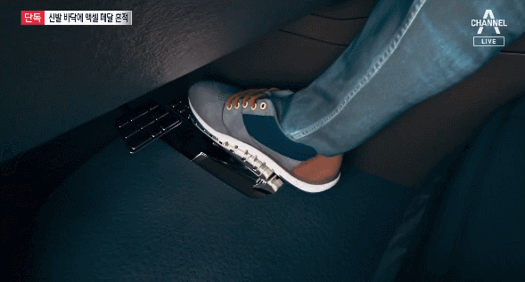 액셀을 세게 밟은 상태에서 사고 등 강한 충격이 순간 가해졌을 때 마찰이 생겨 신발 밑창에 페달 흔적이 남을 수 있다는 예시. 채널A