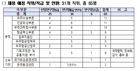 2일 우주청에 따르면, 채용 규모는 31개 직위에 모두 65명으로 선임연구원(5급) 25명과 연구원(6급 33명, 7급 6명, 연구사 1명) 40명이다. 원서 접수 기간은 8월 13~19일이다다. 전형은 서류·면접 등을 거쳐 오는 11월 최종합격자를 발표할 예정이다.