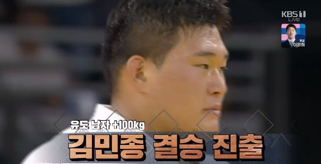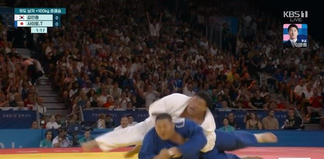 2일(현지 시각) 프랑스 파리 아레나 샹드마르스에서 열린 2024 파리올림픽 유도 남자 100kg 이상급 준결승전에서 한국 김민종(양평군청)이 일본 사이토 다쓰루를 한판승으로 꺾는 모습. KBS 중계