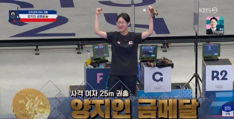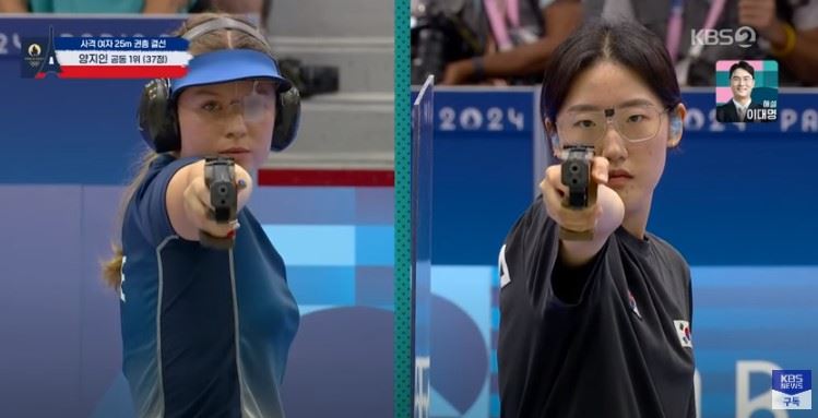 양지인 선수(오른쪽)가 조준을 하고 있다. KBS 중계