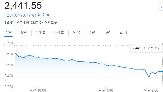 5일 오후 2500선이 깨졌을 때 시황. 이상 구글 코스피 지수 현황