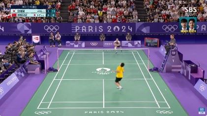 안세영이 5일(현지 시각) 프랑스 파리 아레나 포르트 드 라샤펠에서 열린 2024 파리 올림픽 배드민턴 단식 결승 중국 허빙자오와의 경기 모습. SBS 중계