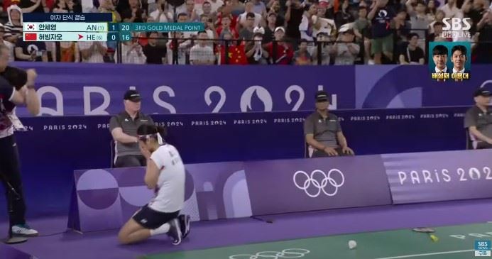 안세영이 5일(현지 시각) 프랑스 파리 아레나 포르트 드 라샤펠에서 열린 2024 파리 올림픽 배드민턴 단식 결승 중국 허빙자오와 경기에서 마지막 포인트를 딴 직후 코트 귀퉁이로 가서 두 손으로 얼굴을 감싸고 있다. SBS 중계