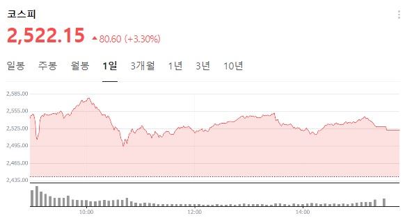 6일 코스피 지수는 전날보다 3.3%(80.60포인트) 오른 2522.15에 거래를 마쳤다.